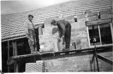 Nya väggar byggdes utanpå de gamla föisväggarna med skadade tellblock som kördes med Valmet 20 från Vörå 1956. Arvid Åberg och Viking Åberg.
