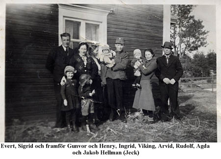 Framför Hellaris - nuv. Gunvor Svarvars stuga. Evert Hellström, Sigrid Hellström, framför dem Gunvor Östman och Henry Östman, Arvid Åberg med Viking i famnen, Agda Östman med Rudolf i famnen och Jakob Hellman (Jeck).