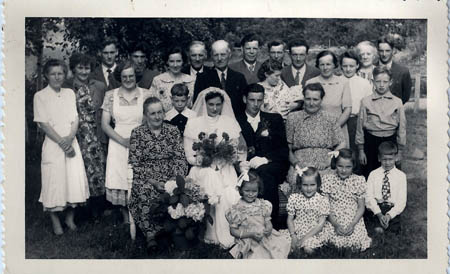 Nils Östmans och Dagny Östmans f. Frantz bröllop i Österhankmo 1953. Från Vassor: Alice Södergård, Otto Östman, Elin Östman med Helena Östman, Arvid Åberg, Ingrid Åberg, Wivi Kultti, Hilda Östman, Kurt Östman, Jenny Östman, Cay Södergård, Monica Södergård, Eivor Åberg, Vivan Åberg, (stående till höger) Viking Åberg och framför honom Henrik Westerback från Österhankmo. Toivo Kultti förde Vassorborna med båt till Dagnys hemgård i Österhankmo.