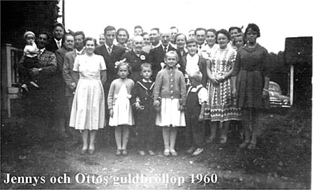 Jenny Östmans och Otto Östmans guldbröllop 1960. Fr. v. Kurt Östman med Sören i famnen, Toivo Kultti, Ellen Rabb, Bruno Östman, Elin Östman, Nils Östman, Dagny Östman, Jenny Östman, Cay Södergård, Hildur Forsell, Teodor Forsell, Otto Östman, Oskar Södergård, Ingrid Åberg, Eivor Åberg, John Rabb, Arvid Åberg, Vivan Åberg, Wivi Kultti, Alice Södergård, Gunhild Östman, och Monica Södergård. Barnen framför är Louise Östman, Yngve Östman, Elisabeth Östman och Arne Kultti. Några bakom är oidentifierade.