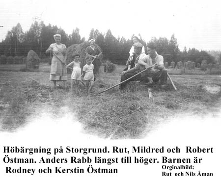 Höbärgning på Storgrund. Rut Östman, Mildred Östman, Robert Östman och Anders Rabb längst till höger. Barnen är Kerstin Östman och Rodney Östman.