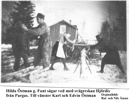 Hilda Östman g. Fant sågar ved tillsammans med svägerskan Hjördis från Pargas. T. v. Karl Östman och Edvin Östman. Gården på Norrstu i bakgrunden.