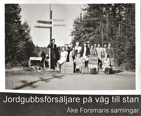 I slutet av 40-talet väntar jordgubbsförsäljare vid vägskälet – Bastuholmsvägen och Kunivägen – på bussen för transport till torget i Vasa. Raden bakom: Enok Flinkfelt, Alfred Willför, Ruben Studd, Sofia Örn, Alida Forsman (g. Hoflund), Etel Pörn, Robert Forsman, Signe Forsman, Ragnar Studd, Elvi Kuni (g. Wasberg), Karl Nymark, Margit Studd. Nedre raden: Salme Klemets, Edna Storm (g. Norrgård), Senny Forsman och Ida Forsén.