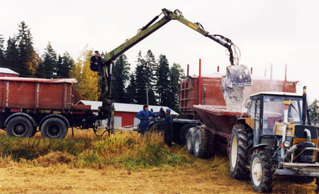Lantmannagillet samordnade och förmedlade 1966 inköp av gödsel och kalk till medlemmarna. Rune Svarvar och Ole Åberg samarbetade med kalkspridningen. Rune körde kalk från Vindala, Siikais, Kemi och Pargas. Från hamnarna i Kristinestad, Vasklot, Kaskö och Yxpila kördes kalk som kom från Gotland. Ole stod för spridningen på fälten. Bilden är tagen på Åkersidan 1993. Rune sköter omlastningen och Ole och Lars Östman står nedanför.