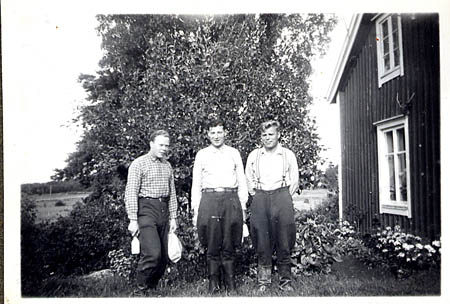 År 1954 gjordes avvägning av markerna inför rensning och nydragning av avloppsdiken. Gruppen som skötte avvägningen övernattade hos Arvid Åberg, och fick mat och matsäck hos Gerda Åberg. Gruppen, försedd med matpåse och mjölkflaska, står utanför Gerdas stuga, från vänster studerande Ole Storsved från Petalax, byggmästare Erik Fant från Malax och ledaren för gruppen, byggmästare Lars Stoor från Malax.