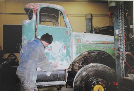 Johnny Friberg slipar och snyggar till en veteranlastbil.