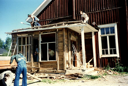 Vassor Uf, första talkodagen 27.5.89 Richard Wik och Jan-Erik Hinders på taket. Ulrik Rabb i fönstret. Wassor Ungdomsförening. Vassor uf renovering