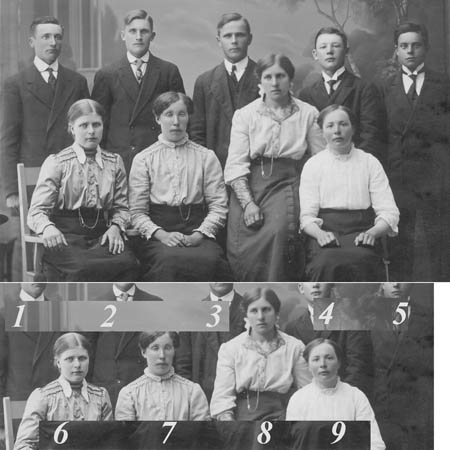 1.Alfred Kuni f. 1893. 2. Alfred Studd. 3. Karl Holm. 4. Alfred Forsén. 5. Evert Sund. 6. Helga Kuni f. Galt. 7. Tilda Ingman. 8. Aina Studd f. Kuni. 9. Ida Kuni f. 1891 (Alfred Kuni syster).