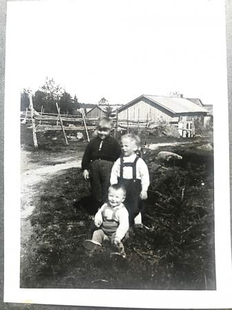 Fr. v. Bernhard Sand, Valter Grops son (inget namn) och sittande Bengt Ahlskog. Kortet är från Sixten Wahlströms album. I bakgrunden Gunnel Willförs g. Wahlström hemgård.