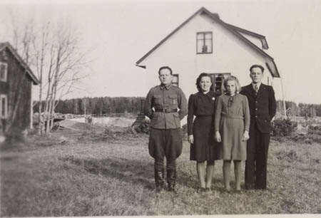 Syskonen: Erik Rabb, Alice Rabb, Astrid Rabb och Oskar Rabb. I bakgrunden John Rabbs stuga vid Dalas.