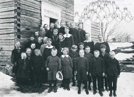 Kuni missionsförsamlings söndagsskola 1927–1928. Lärarinnor: Olga Berg och Sigrid Nyman. I f. d. Isak Sillmans stuga på laggen (Gamla bönehuset). 1. Ragnar Studd, 2. Lennart Forsman, 3. Sanfrid Forsman, 4. Valfrid Södergård, 5. Elsa Bergström, 6. Gunnar Forsén, 7. Kurt Sundäng, 8. Elvi Kuni, 9. Runar Berg, 10. Elis Rådman, 11. Alice Rådman, 12. Ines Willför, 13. Inga Willför, 14 Ida Forsén, 15. Elna Nymark (Forsman), 16. Anni Rådman, 17. Maria Stucki, 18. Elin Studd, 19. Signe Bäck, 20. Jenny Forsman, 21. Valter Forsman, 22. Irene Forsén, 23. Bertel Haldin, 24. Harald Wasberg, 25. Sanfrid Forsén, 26. Birger Bäck, 27–28. Systrarna Nygård. Se VBH III s. 264