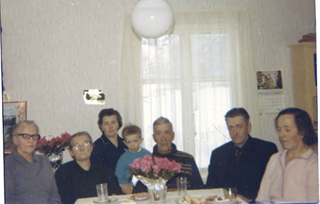 Irene Nygård (Matildas syster), Matilda Rabb f. Beijar, Marita Nygård f. Rabb, Christer Nygård, Verner Rabb (Slaktraverner), Arne Rabb, Verna Rabb f. Grims i Vörå. Matildas 80-årsdag. Verner och Matilda bodde på Källbacken i f.d. Källback Britas stuga.