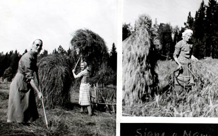 Signe Bäck och Mary Bäck i skördearbete. Kornet togs med skära.