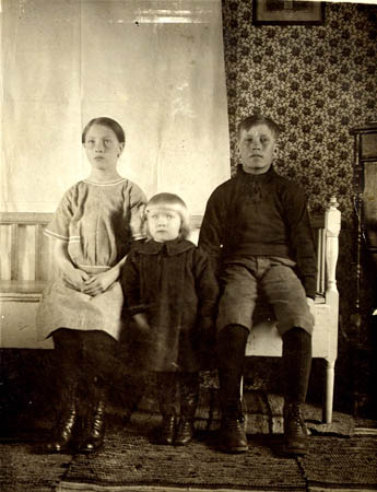 Tre av familjen August Bäcks barn i hemmiljö. Till vintern var det, för värmens skull, vanligt att golvet helt täcktes med hemvävda trasmattor.