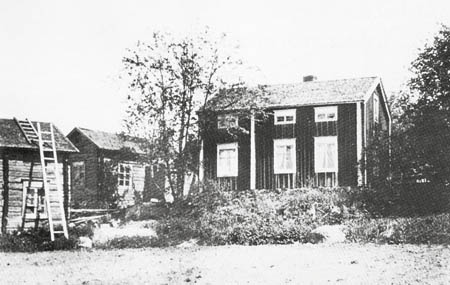 Isak Erik Åmans backstuga på Laggen. I stugan bodde först skräddaren Karl Gustav Willför med hustru Fredrika. I mitten barnskolan och till vänster Stinas, Maria Kristina Ingo gift med Abraham Willför, stuga. Se VBH III s. 262.