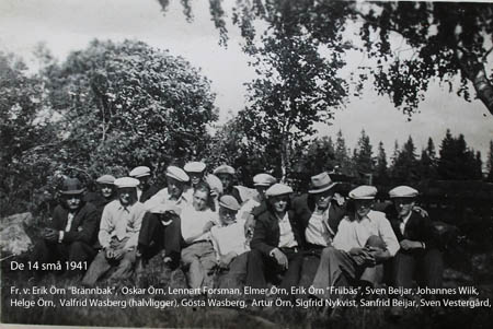 De 14 små 1941. Fr. v: Erik Örn “Brännbak”, Oskar Örn, Lennart Forsman, Elmer Örn, Erik Örn “Friibäs”, Sven Beijar, Johannes Wiik, Helge Örn, Valfrid Wasberg (halvligger), Gösta Wasberg, Artur Örn, Sigfrid Nykvist, Sanfrid Beijar och Sven Vestergård. Uppgiftslämnare: Bertel Wik, Gunvor Svarvar och Edvin Vestergård.