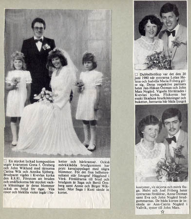 Tidningsurklipp, vigslar. Greta Örnberg, John Wiklund, Lolan Friberg, Isabella Friberg, Jan-Håkan Östman, John Mats Nygård.