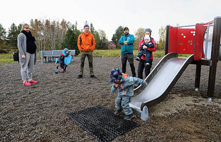 Isak Heir rutschar ner för klätterställningens rutschkana medan mamma Sanna-Sofia Heir (till vänster), Melker Käld, Tobias Käld, Tom Heir samt Minna Östman och Ella Käld tittar på. Se Vbl text. Lekpark vid Sandåsvägens korsning. Lekplats Läs mera...