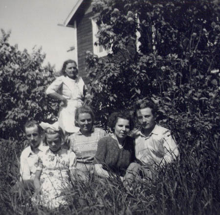 Framför gården på Västerbacken som Roy och Eve köpte av Sanfrid Rabb sitter Ragnar Studd Maj-Len Studd, Etel Studd, Eve Nässlin, Roy Nässlin och bakom Vendla Thorberg.