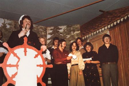 Julfest 1980. Carl Gustav Näsman, Leif Vestergård, Yngve Östman, Rune Forsman, Carita Norrgård, Johan Wasberg, Birgitta Wiik och Peter Rådman.