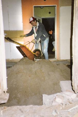 John Östman fyller köksgolvet med sand i september 1990. Roland Frantz i bakgrunden. Vassor uf renovering.