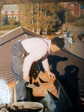 Edvin Enroth murar sonen Bengt Enroths skorsten hösten 1979.