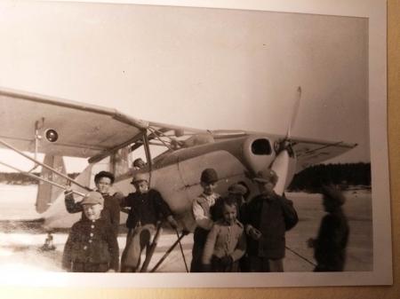 Flyguppvisning på isen i Sandåssundet 1956. Bengt Enroth står längst till vänster. Det var dyrt att komma upp och få ett varv runt byn och Bengt ansåg sig inte ha råd.