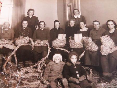 Ester Lundberg (stående till vänster) höll 1942 i Vörå en kurs i tillverkning av halmskor. Erfarenheterna under den kalla krigsvintern 39–40 gjorde att man insåg behovet av att kunna skydda manskpet mot förfrysningar. Halmskorna tillverkades av råghalm och drogs utanpå stövlarna.