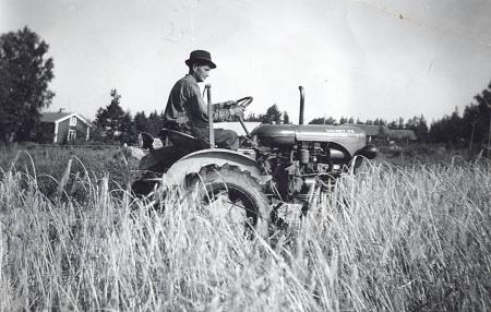 Arvid Åberg skär korn med Lill Valmet och en grind fäst på slåmaskinen. I bakgrunden Hellaris Norribyn.