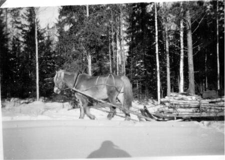 Hästen Ture med ett skårvedslass i "Bettjiskärr". Arvid Åbergs häst är selad med vintersele: fimmelstänger, stöttingar och "langskravan". Arvid var varje vinter på 50- och 60-talen i arbete åt skogsbolagen.