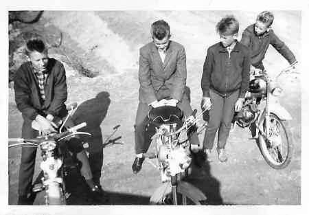Fr. v. Håkan Lundberg, på sin moped Victoria. Kaj Öman, Bernhard Smeds utan moppe. Alf Hellman på Lars Öhrns Tunturi. Örn.
