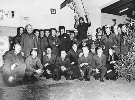 Bilden visar de anställda på verkstaden sista eftermiddagen innan företagets julfest samma kväll i Kvevlax Ungdomsförenings lokal. Håkan Lundberg, längst nere till vänster, fotade sina arbetskamrater med kamerans självutlösare.