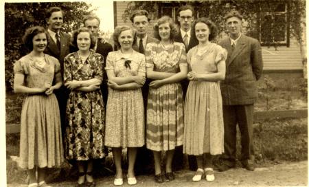Uppvaktning: Kunibor uppvaktade Otto Granér på hans 50-årsdag. Fr. v.: Barbro Nyman, Elvine Friberg, Alice Kuni, Helvi Koivisto, Rigmor Nyman, Ruben Studd, Karl Kuni, Sigfrid Mälsor, Olof Willför och Gösta Kuni.