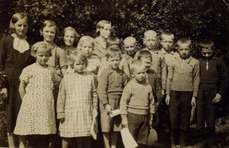 Söndagsskola i Kuni. 1. Margit Studd, 2. Sally Rådman, 3 Doris Kuni, 4. Heli Koivisto, 5. Anni Sandvik (Grop), Börje och Hilding Sundäng, Karl och Gösta Kuni, Ragni Kuni, Olof Willför, Ruben Studd och Enok Flinkfält. 1930 tal