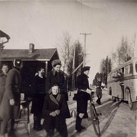 Kuniborna väntar på bussen med post utanför butiken i Sundet. Konduktören ser till att allt går rätt till.