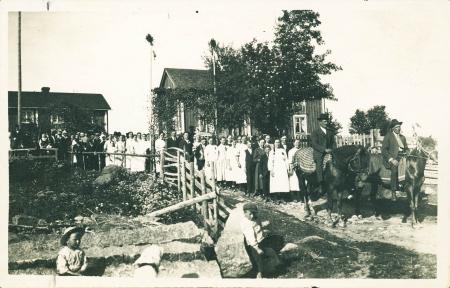 I Koskö gifter sig Johannes Nygård (d. 1976) och Matilda Burman (d.1968) i Juli 1923. Vi tar den med i Vassor bys fotoregister därför att den är speciell med förridare och att brudparet går mitt i följet mellan två grupper av vitklädda flickor. Hästtäcken liknande de på bilden var vanliga.