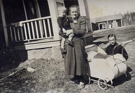 Vid Norrstu, Jenny Östman håller barnbarnet Viking Åberg i famnen och Kurt Östman sitter bakom vagnen.