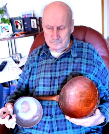 Sanfrid Friberg på Hagnäs visar upp två kopparskopor som han har hand om. Hans farfars far började som bysmed 1818 i Norribyn i Vassor och också efterkommande var smeder och kopparsmeder i flera genarationer.