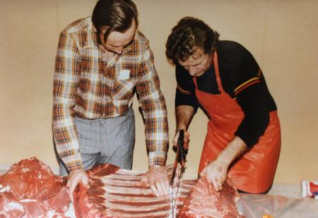 Älglaget ordnade en älgstyckningskurs i Uf-lokalen 1978 under ledning av Georg Glasberg. Bertil Rabb följde noggrant med styckningen.