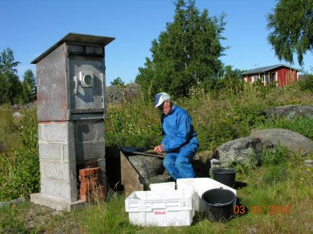 Robert Östman rensar abborrar på Aspskärsgrundet 2005 i Mickelsörarna. I bakgrunden Alf och Gunnel Hellmans stuga.