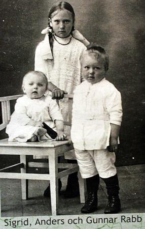 Syskonen Anders Rabb, Sigrid Rabb och Gunnar Rabb, barn till Anna Brita Rabb (f. Udd, 1883–1956) och Johannes Rabb (1885–1927) på Laggen. Anders Rabb (1919–41) dog i fortsättningskriget. Gunnar (1917–1936) omkom när han fiskade på Vassorfjärden och träffades av blixten. Sigrid (gift Nyman, 1911–94) levde större delen av sitt liv på Bjäänesi/Bergnäset. De tre hade ytterligare fyra syskon, Adele som dog som liten, Brita, Ester och Ragnhild.