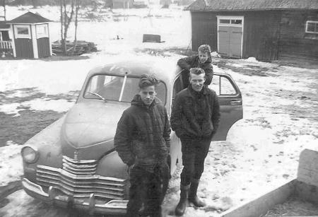 Motorburen ungdom i Vassor. Bilen var en Pobeda som Åke Hellman övergett. Fr.v. Bernhard Smeds, Håkan Lundberg, och Alf Hellman som gjorde grovjobbet för att få bilen rullade igen.