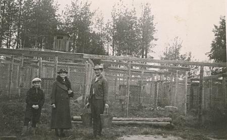 Runar Dahlberg framför rävfarmen på Bjynis backen. Damen och pojken är okända. Tornet ovanför rävburarna användes för att övervaka parningen.