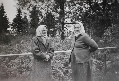 Maria Åberg (1886–1964) och Jenny Östman (1888–1968) står på Östmans gård framför en bom. Det troliga är att bommen stängde av den lilla väg som gick från Brännbackvägen direkt till trappa på Norrstu (Otto Östmans). Troligen för att stänga för kreatur som gick längs vägen. Körvägen gick bakom huset.