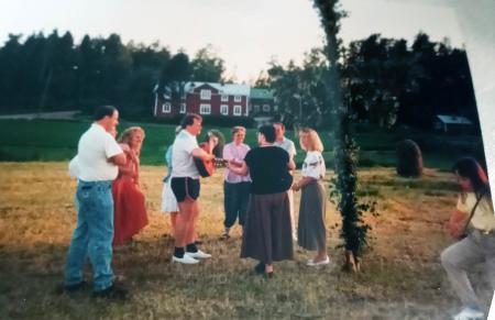 Midsommarfirandet på "Dalin" i Kuni 1990. MIdsommarfirande med midsommarstång bland höstörar på "Dalin" 1990. Misstänker att det är Sakke Mäki - Fränti stå längst till vänster, tror det är Marina Wasberg i röd kjol, Roland Herberts på gitarr, Ann - Lis Nitovuori (troligen är det hon med ansiktet mot fotografen), Monica Rådman närmast stången, Margareta Svanfors vänder ryggen till och Greta Saar kommer hoppandes" Veronica Rådman har gett uppgifterna.
