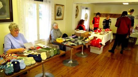 Vassor Marthaförenings höstmarknad 8.10.22. Försäljarna Ulla Wasberg och Gun-Maj Näsman säljer sockor, Gun-Maj säljer även honung. Marina Silvan-Wasberg och Eva Grop från RK Kvevlax avdelning delar ut ballonger samt säljer bl.a. lakritsremmar, Helena Östman säljer lotter i marthornas lotteri.