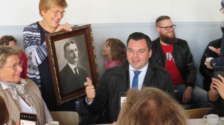 Invigningen av nyasfalterad Vassorväg och lekparken. Industrirådet John Wickström uppmärksammdes och Helena Östman visade upp en förstoring av Wickström för Monica Siren-Aura och Joakim Strand.