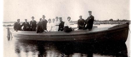 Utfärd till Holmön 1917. Edvard Wik står längst till höger och Johannes Björkman/Wik mellan damerna. Bilden finns i Johannes Björkmans samlingar. Det var förbjudet att färdas på sjön men den ryska bevakningen fungerade inte.