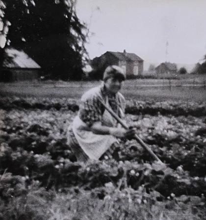 Elsa Vestergård (född Backman, 1899-1989) i sitt jordgubbsland vid Nyback. I bakgrunden Wasbergs "Vaasbäs".