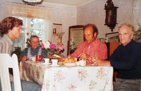 Kaffe med dopp och Sverigegäster på Nyback på 1970-talet. Från höger Verner Vestergård med sonen Sven, fru Elsa och Vassorfödde sonsonen Rolands fru Ulla.